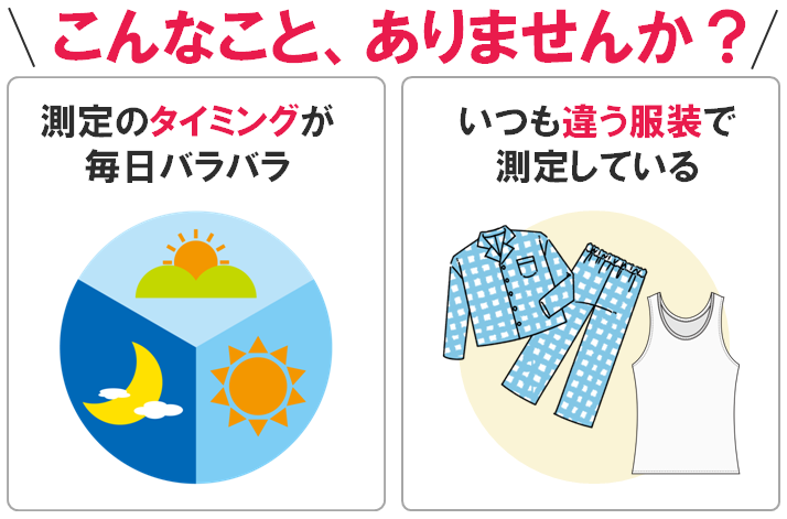 数値への影響を最小限にするには「同じ時間帯に測定する」「食前か食後でタイミングを決める」「薄着で測定する」など、測定の条件をそろえるのがおすすめです。