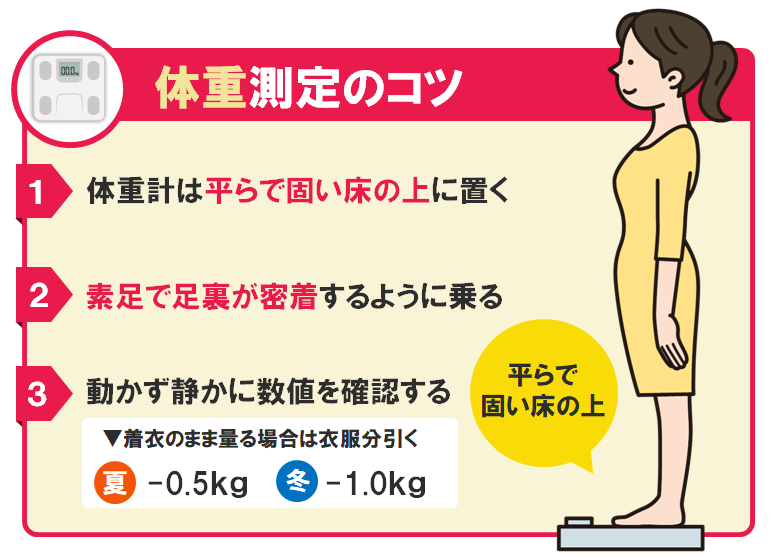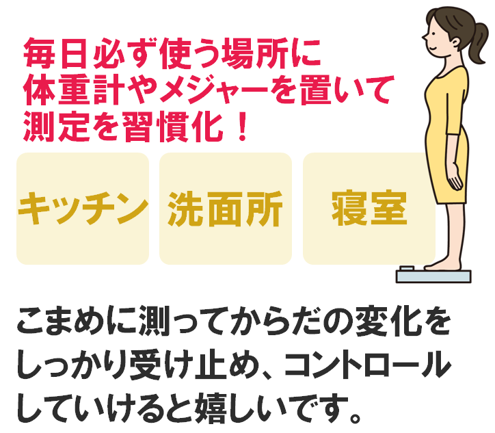 こまめな記録は、「食べ過ぎ」や「運動不足」など、変化の要因を自己分析するのにも役立ちます。体重測定が難しい時は、鏡に映ったご自身のスタイルや、衣服の着心地などでからだの変化を感じ取るのもおすすめです。