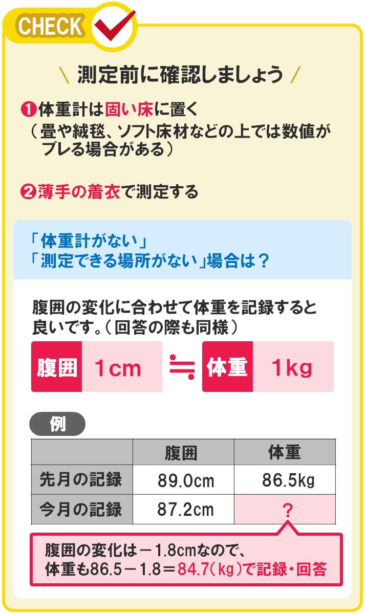 腹囲・体重の測定は、健康づくりの成果を簡単に確認できる手段です。また、「減量効果が出やすい取り組み」や「からだの嬉しい変化」にいち早く気づけるのが測定・記録のメリット