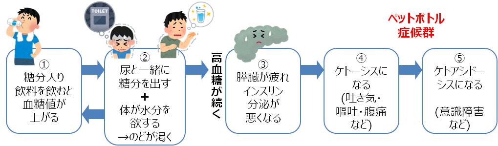 実は、せっかくの水分補給も飲料によっては「ペットボトル症候群」(ソフトドリンクケトーシス)を引き起こしてしまう可能性があります。