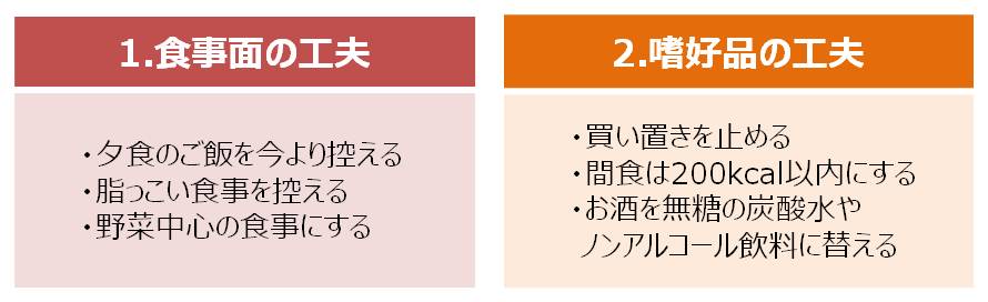 飲食面の調節は1回の取り組みでカットできるカロリーが大きいため、減量効果が高く、即効性も期待できます。