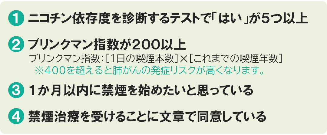 禁煙外来では、下記の条件を満たすことで健康保険等が適用されるため、個人負担が軽くなります。