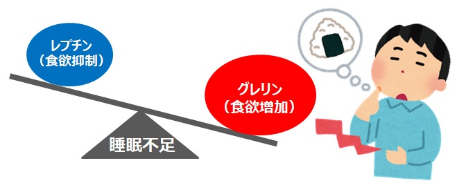 睡眠時間が短いと食欲が刺激されてしまいます。それには、食欲を増加させるホルモン『グレリン』の量が増え、反対に食欲を抑えてくれるホルモン『レプチン』の量が減ることが影響しています。