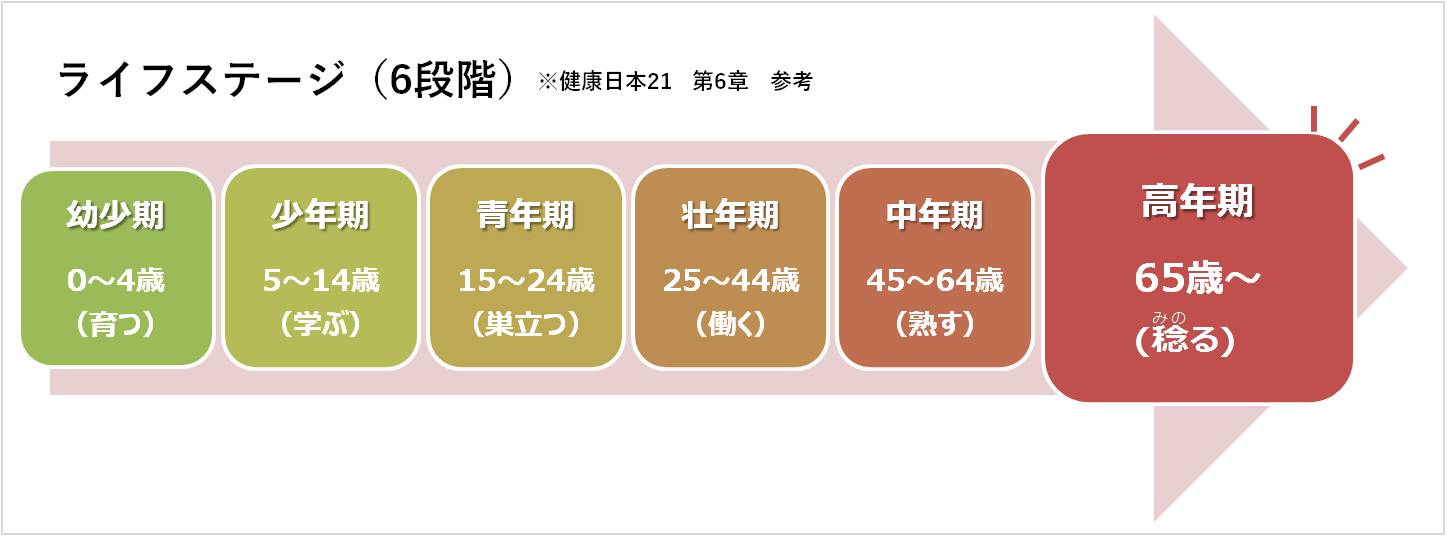 高年期は、仕事や子育てを終えられた方も多く、趣味の時間が増えるなどご自身のための生活ができる時期です。一方で、生活環境の変化や健康状態の悪化に不安を感じることも多くなります。重篤な病気や寝たきりにならず、自立した生活を送ることができるよう、健康に対する意識を高めていきましょう。