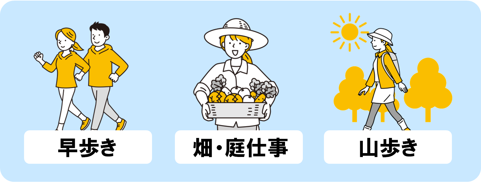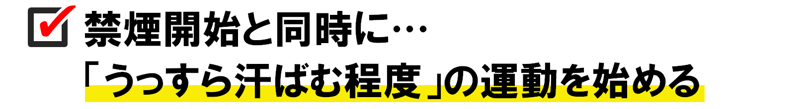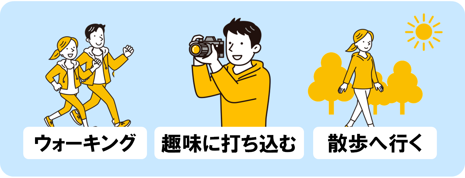ウォーキングなどの運動には、エネルギーを消費するだけでなく、「タバコを吸いたい!」という気持ちやイライラといった離脱症状を和らげる効果があります。また、離脱症状として表れる食欲亢進を抑える快効果が報告されています。