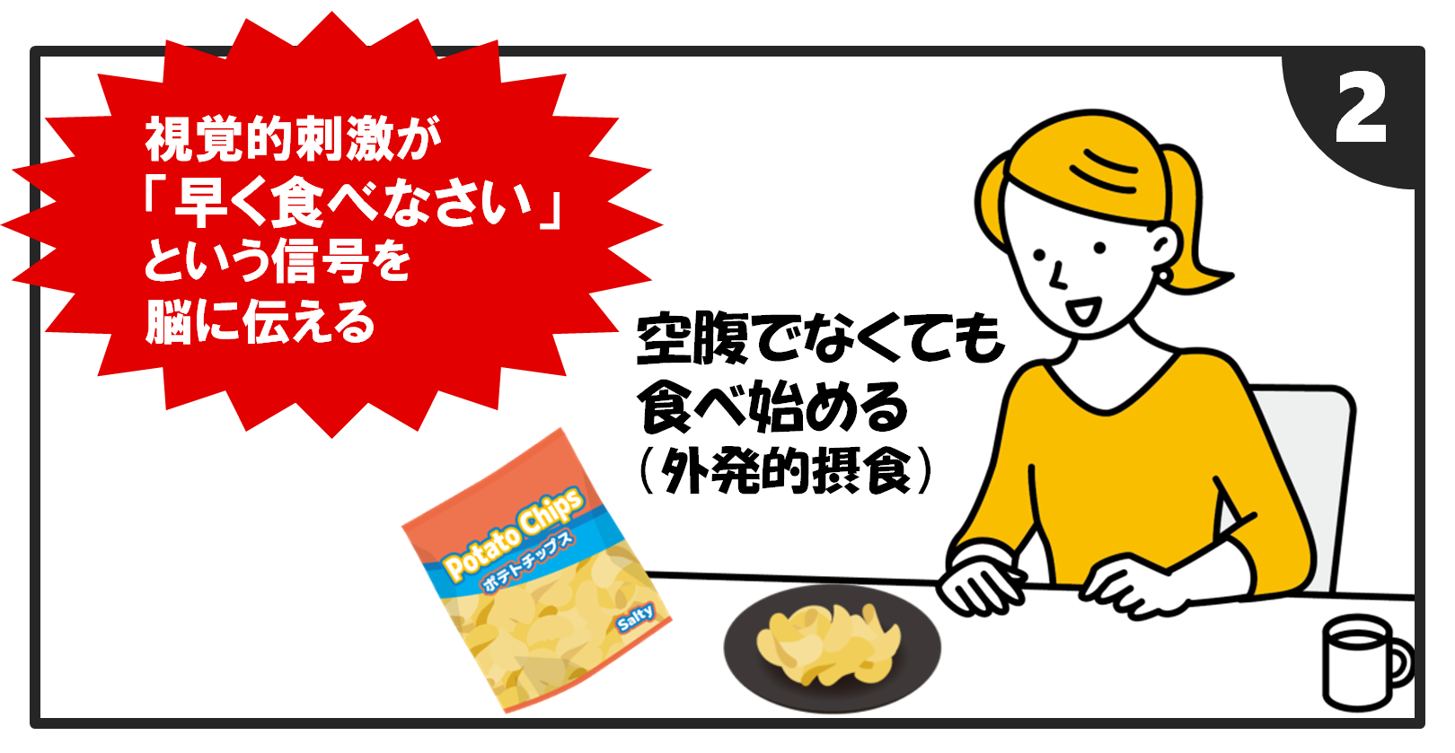 「ついつい食べ」をする時、ヒトの脳では下記のような動きが起こっているそうです。