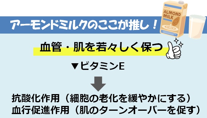 【アーモンドミルク】抗酸化作用のあるビタミンEが含まれる。血行促進も期待できる。