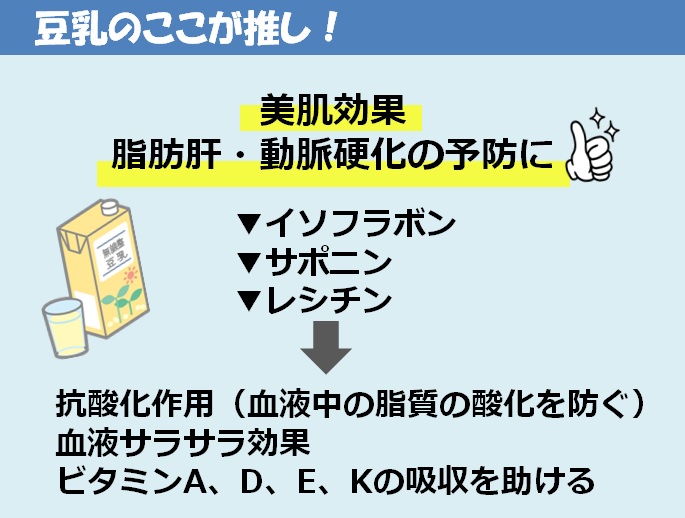【豆乳】たんぱく質が豊富に含まれている。脂質の酸化を防ぎ動脈硬化の予防が期待できる。