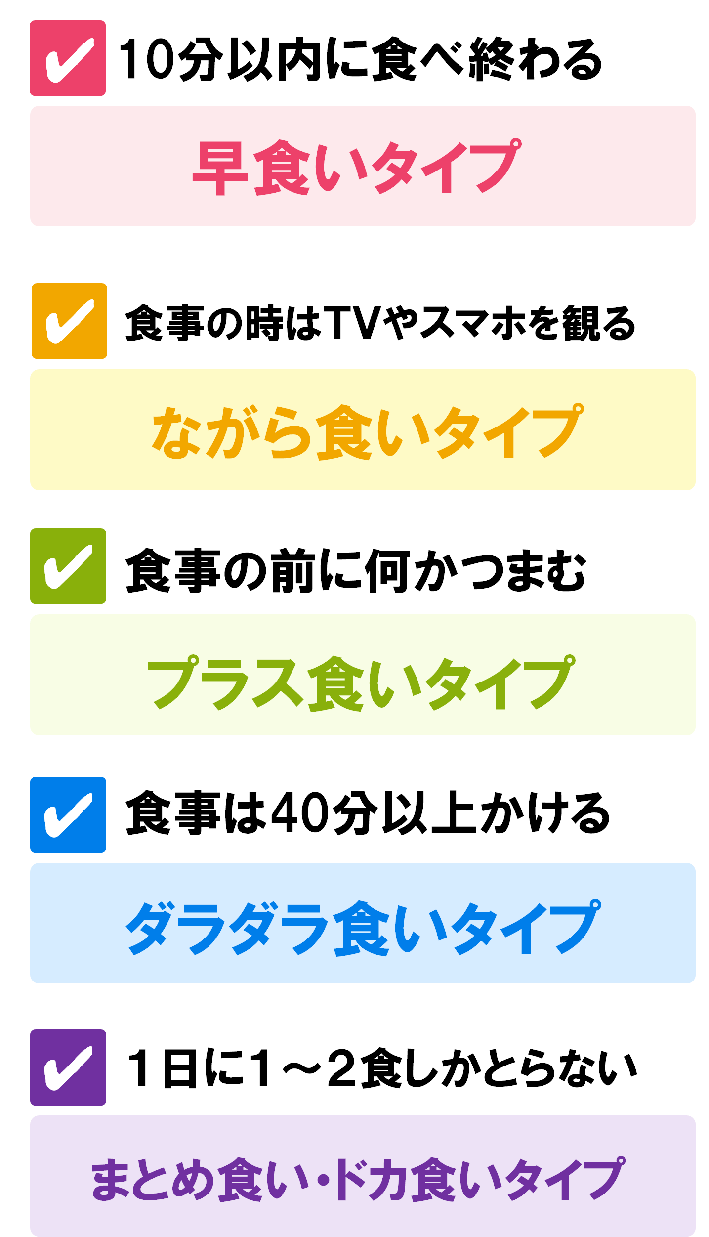 ご自身の生活を振り返ってみて、当てはまるものはありますか。食べ方を見直すことで、体重コントロールや健診データ改善につながります。