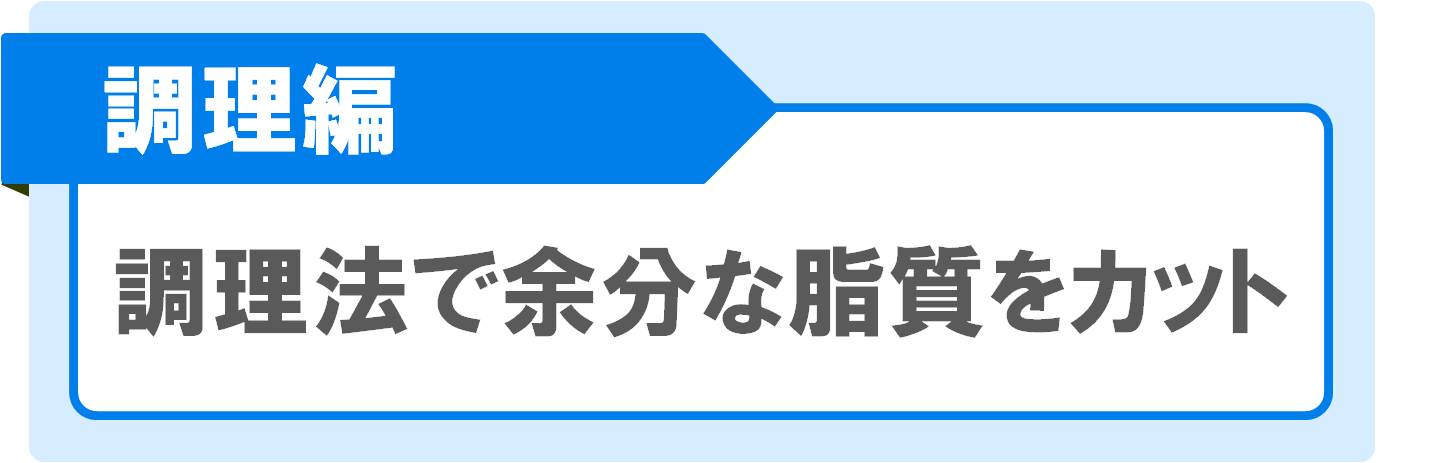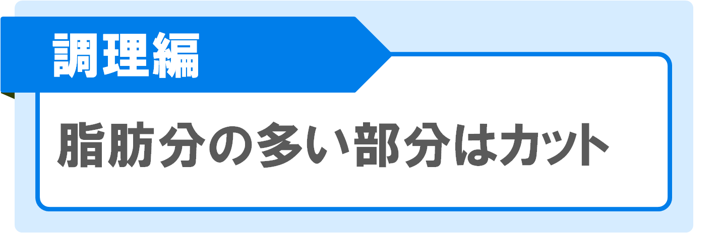 - 脂肪分が少ない食材を選ぶ(白身魚・ヒレ肉・胸肉・ささみ など)