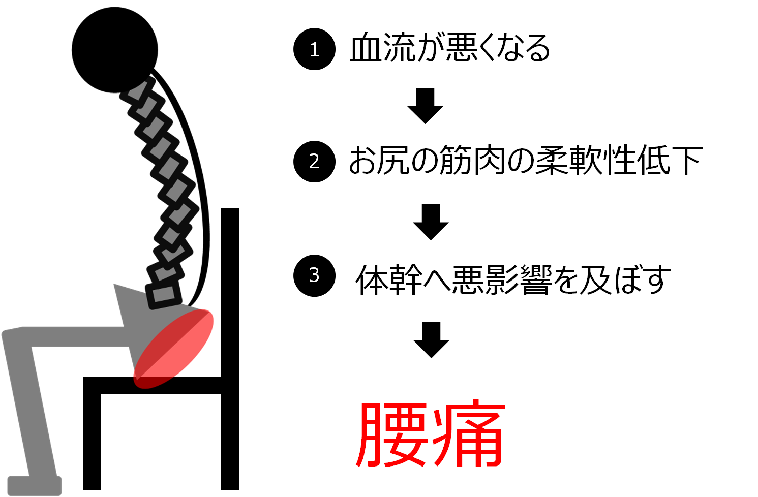 血流が悪くなり、お尻の筋肉は柔軟性が低下し、股関節が硬くなります。