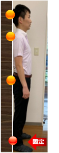 1.壁にかかとをつけて立ちます。次に、お尻、肩、頭も壁につけます。