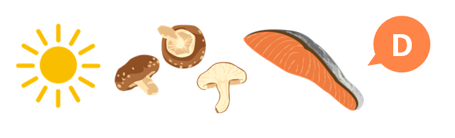 魚類やきのこ類に多く含まれているため、カルシウムの吸収を助けるためにも、これらの食材を一緒にとるようにしましょう。