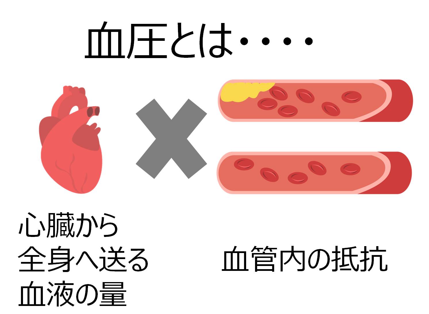 血圧は、心臓から全身へ送る血液の量×血管内の抵抗で決まります。