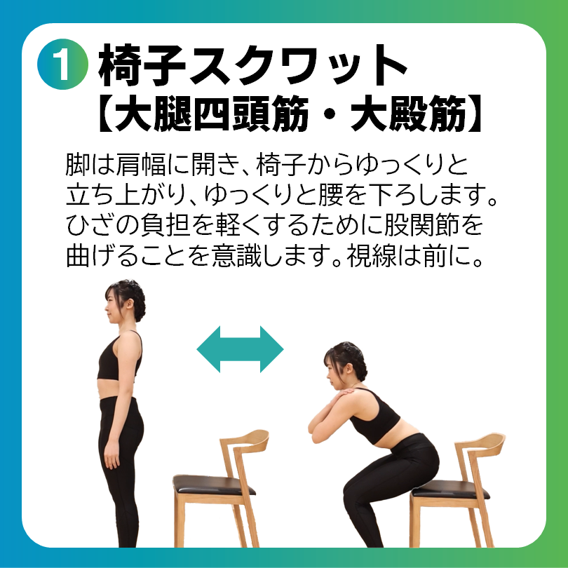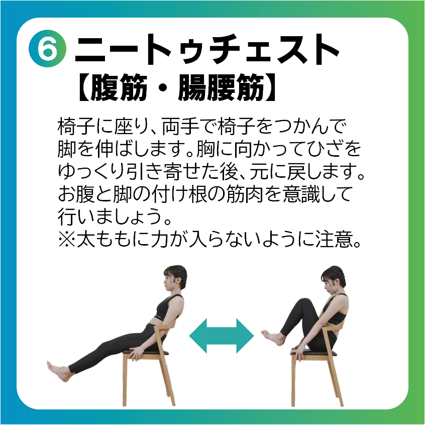 基礎代謝アップの効果を早く感じたい方は、大きな筋肉を動かす椅子スクワット・ニートゥチェスト・腕立て伏せがおすすめです。