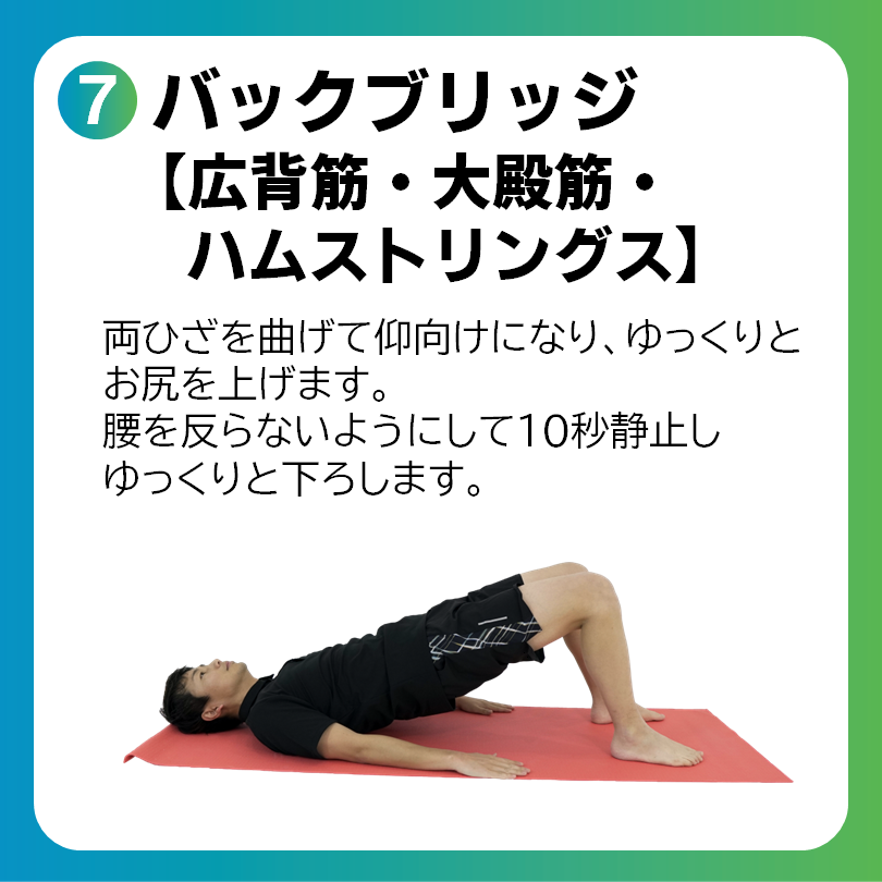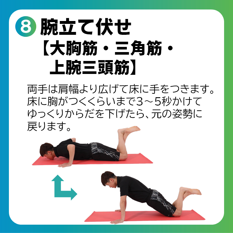 鍛えたい部位に筋疲労を感じるまで10回を目安に行いましょう。
