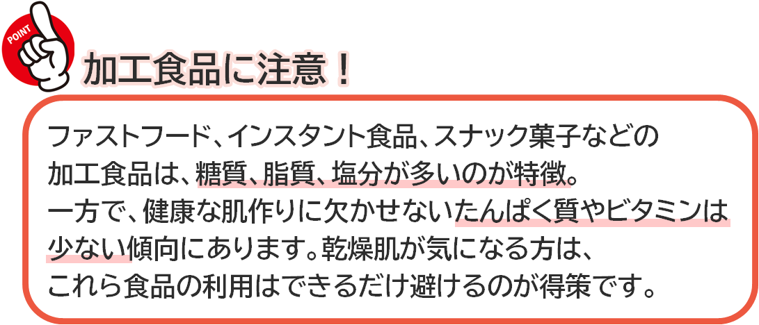 乾燥肌の原因として真っ先に思い浮かぶのは保湿不足などですが、実は食事バランスも大きく関わっています。