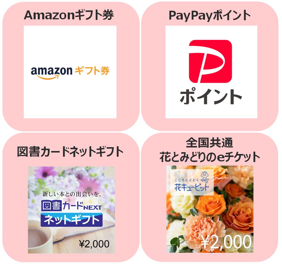 以下の4つのギフト券から、お好きなものを1つお選びいただけます。