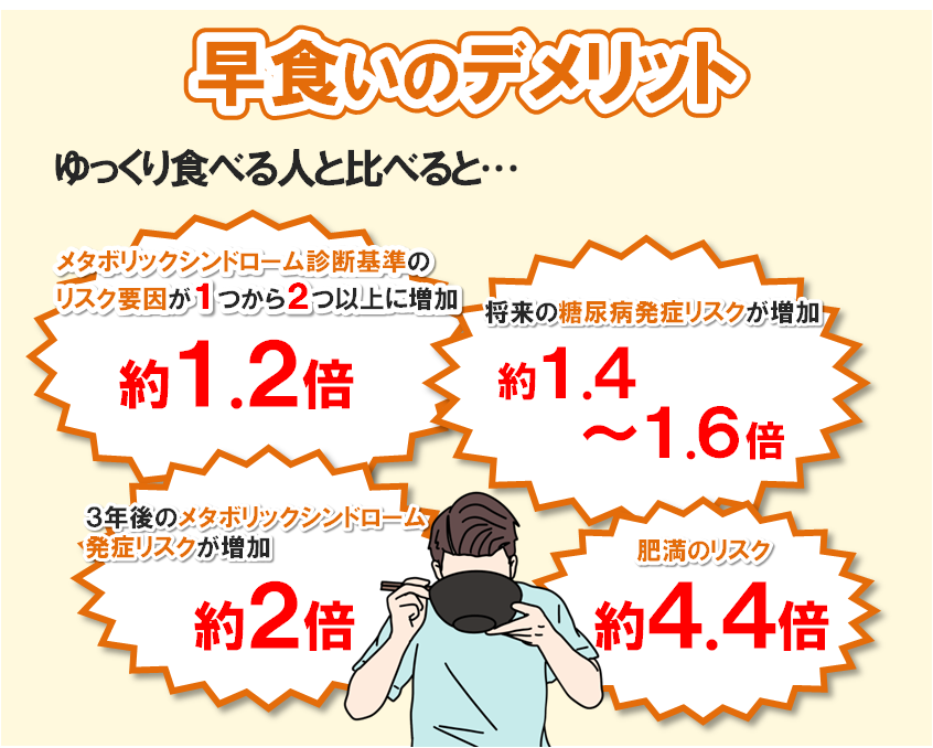 食べる速度が「速い」こととメタボリックシンドロームの関わりについて、多くの研究結果が報告されています。