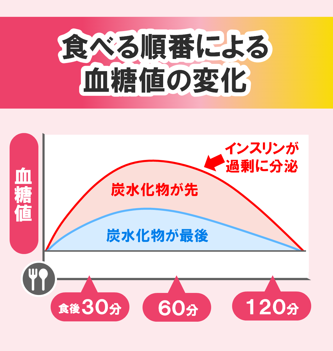 炭水化物(吸収されるとすぐに血糖値を上げる)を先に食べると、血糖値を下げるホルモン(インスリン)が過剰に分泌されます。