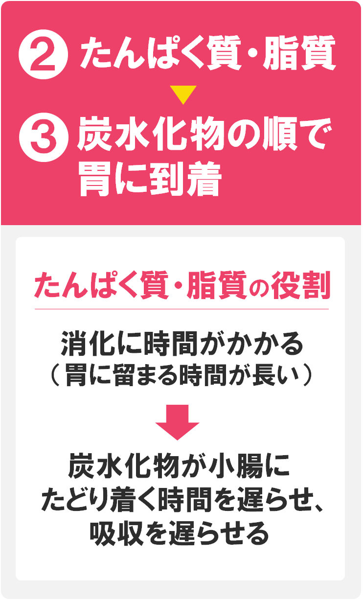 イメージができれば、①食物繊維→②たんぱく質・脂質→③炭水化物の順に食べたくなるはずです。