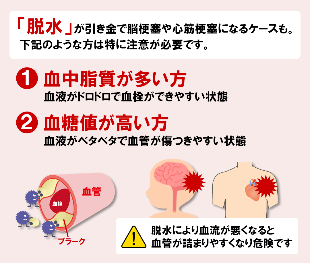 水分摂取量が不足し血液の粘度が上昇すると、血流が悪くなるだけでなく、心筋梗塞や脳梗塞の発症リスクも高くなります。
