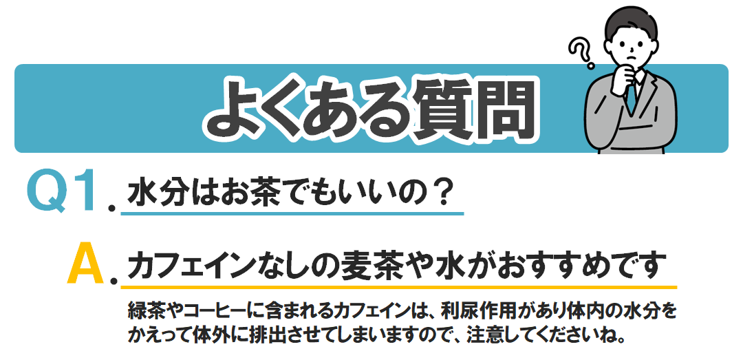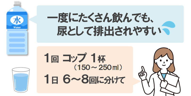 一回の補給で吸収できる水分は200~250ml程度です。一度にたくさん飲んでも尿として排出されやすい他、むくみの原因になったり意識障害などの水中毒を引き起こすので、こまめに飲むようにしましょう。