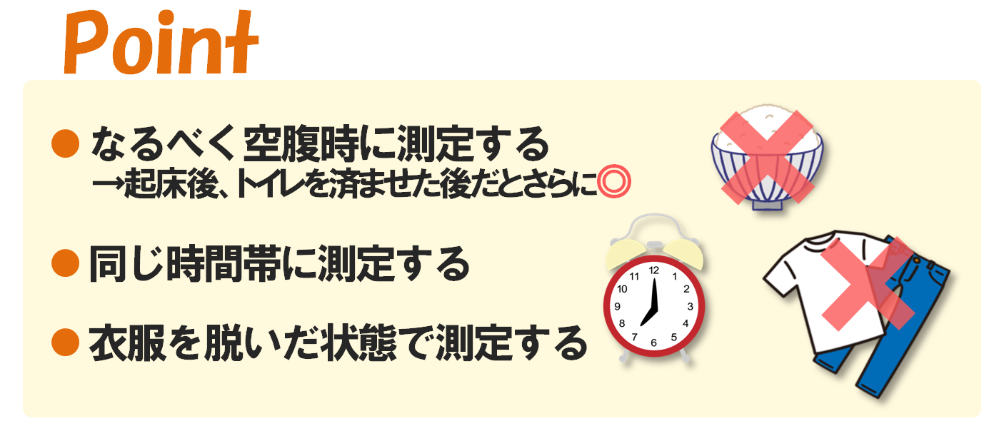 体重や腹囲は1日の中でも増減するため、測定のタイミングが大切です。