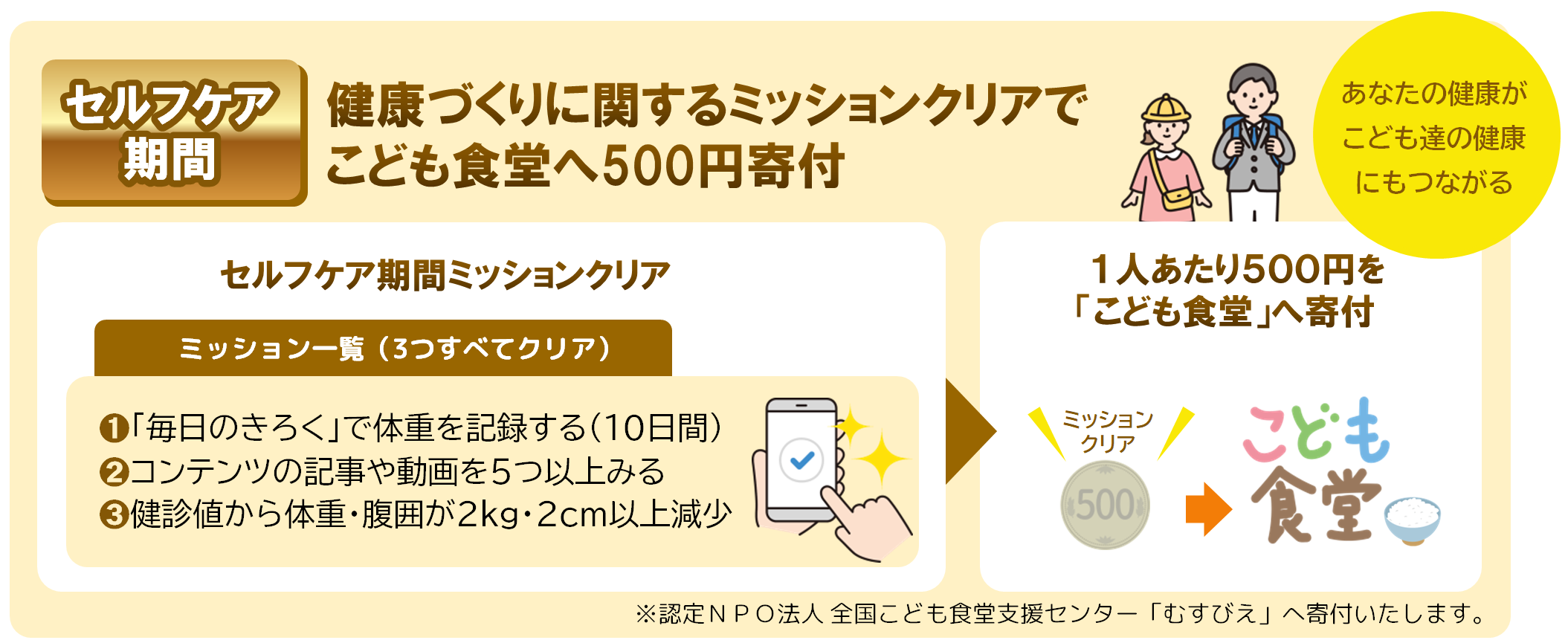 支援期間終了後のセルフケア期間中(プログラム終了から3か月間)、健康づくりに関するミッション3つをすべてクリアすると、こども食堂へお一人当たり500円(こども2.5食分)を寄付いたします。