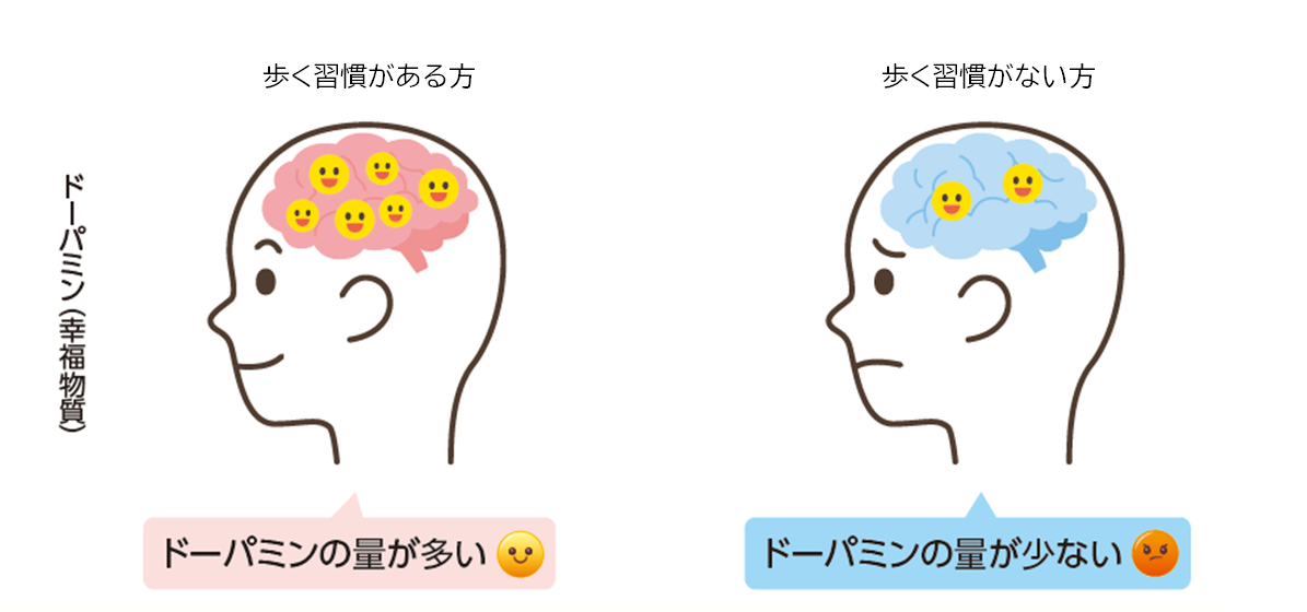 ウォーキング等の適度な有酸素運動で全身の細胞に酸素が送り込まれると、脳内の血流量が増えます。その結果、幸福物質と呼ばれる『ドーパミン』の分泌が促進され気分の調節に役立ちます。運動後はストレスや不安が軽減され、『達成感』や『幸福感』をもたらすこともわかっています。