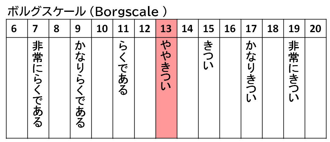 こちらの『Borgscale(ボルグスケール)』は、主観的にどの程度「きつさ」を感じているかを示す指標です。