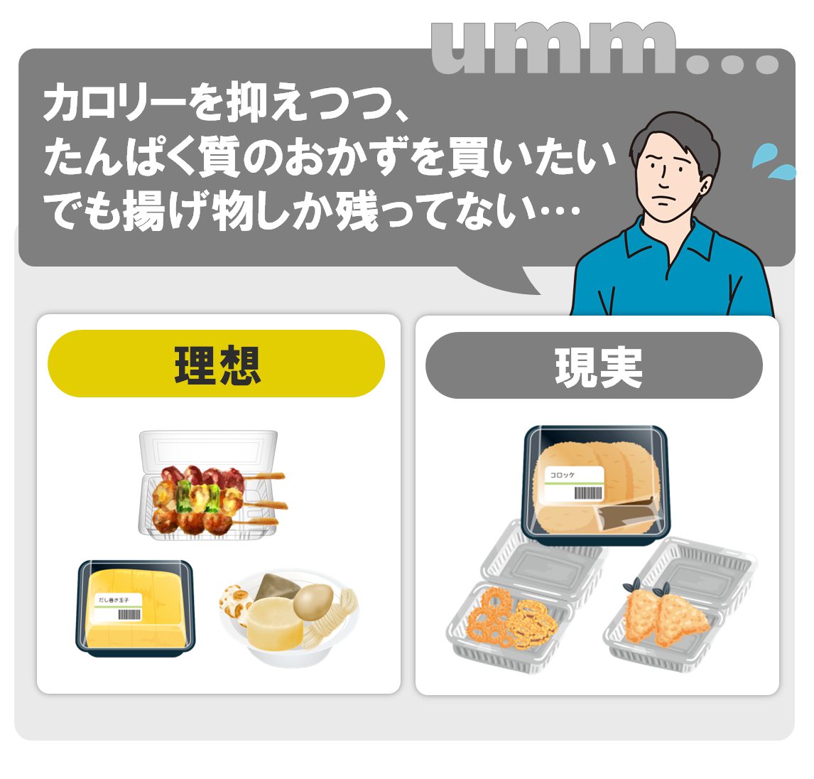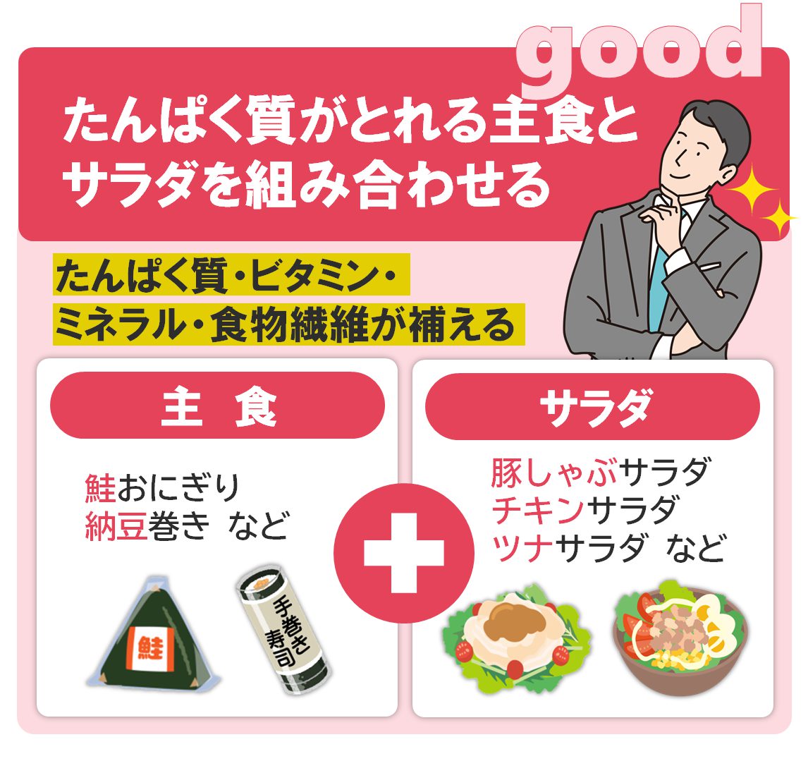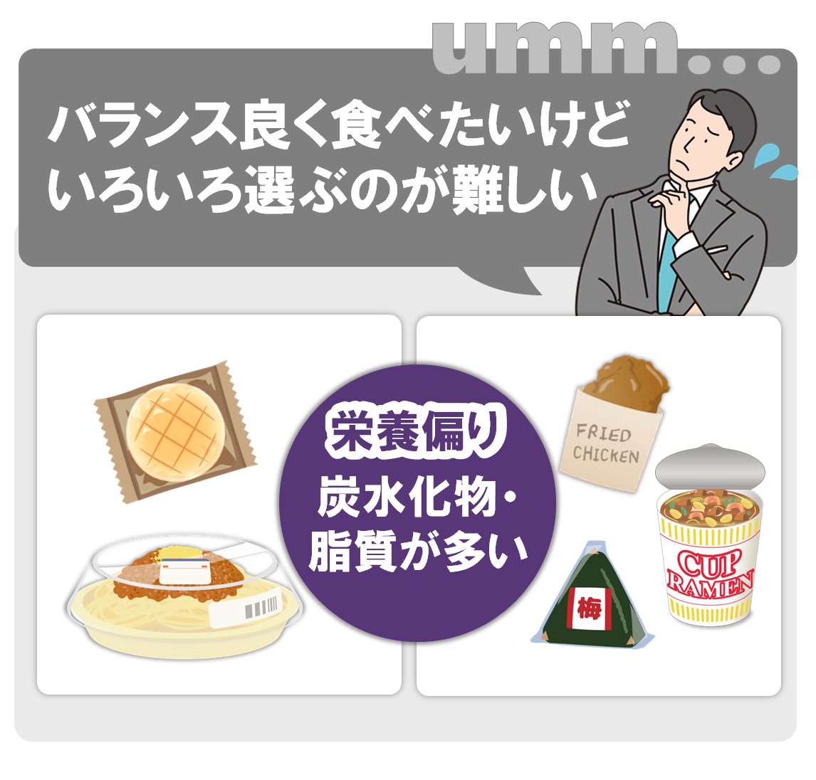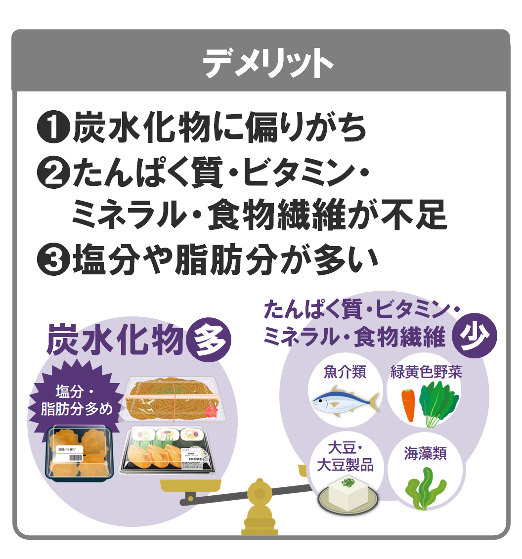 食べたいものを必要な分だけ、少量ずつでも購入できるのが中食のメリットですが、一般的に炭水化物に偏ることも多く、たんぱく質やビタミン・ミネラル、食物繊維が不足する傾向にあります。