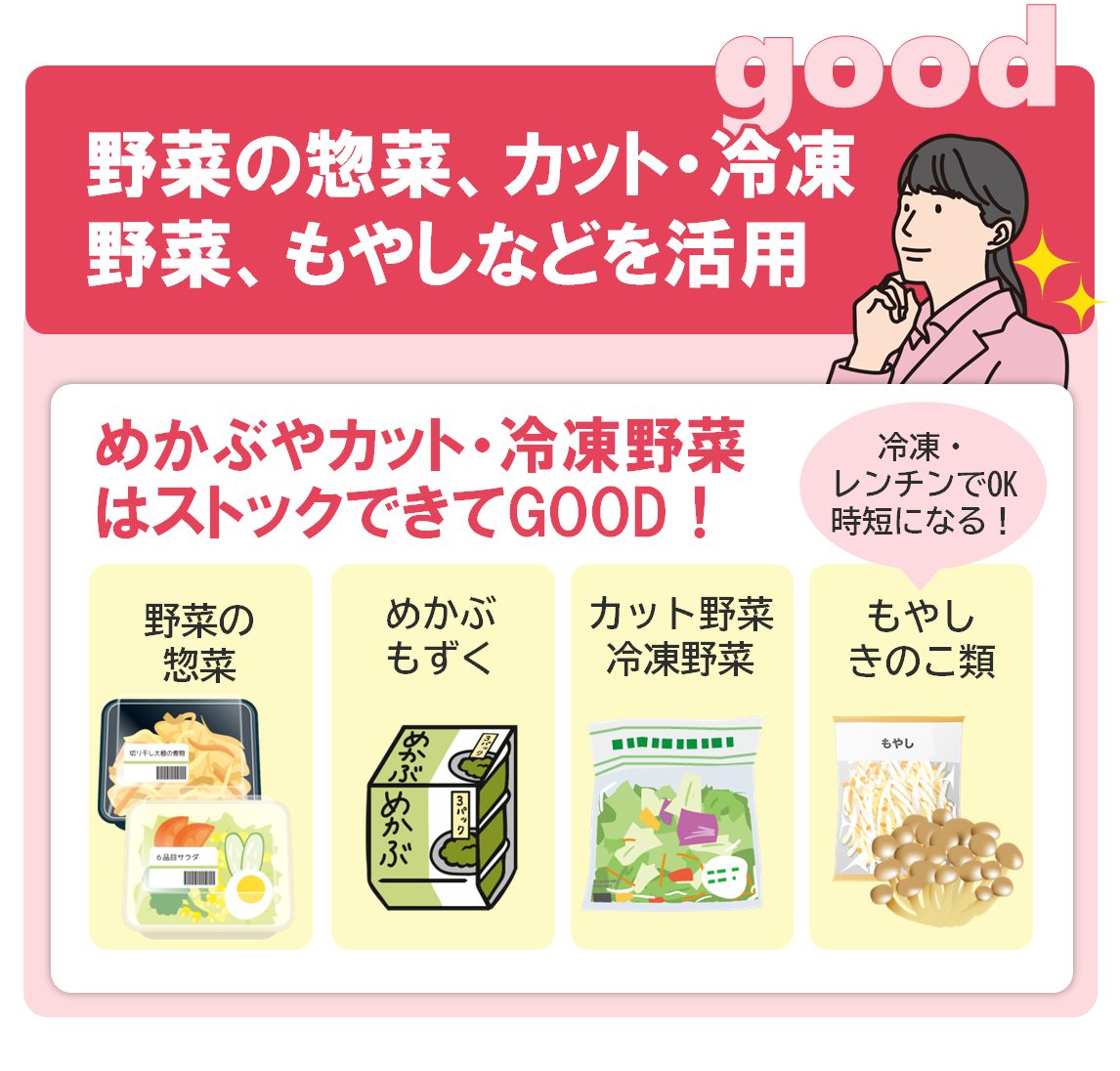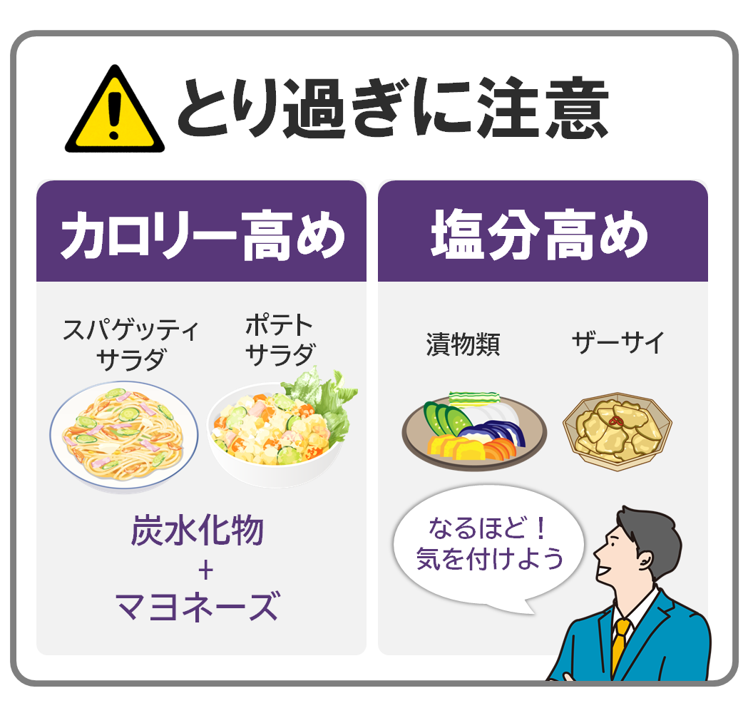 調理済の惣菜を購入し、持ち帰って食べる中食。種類も豊富で家事の時短にもなるため活用する人が増えていますが、健康づくりを進めるにはどこに気をつければよいのでしょう?