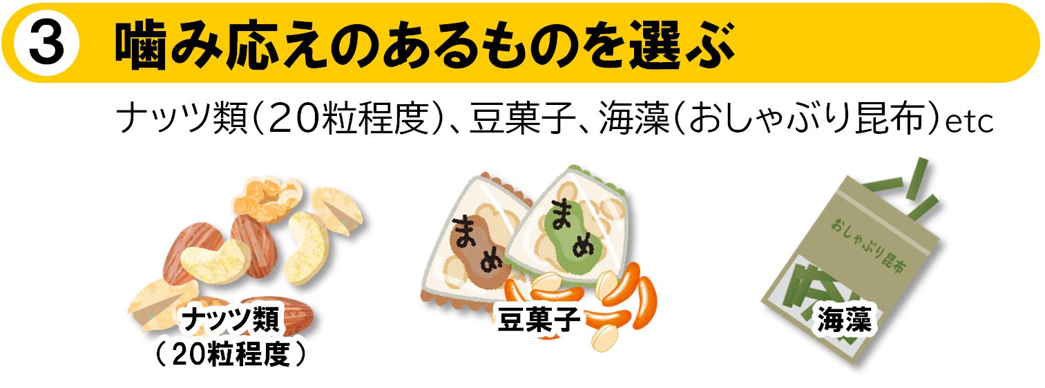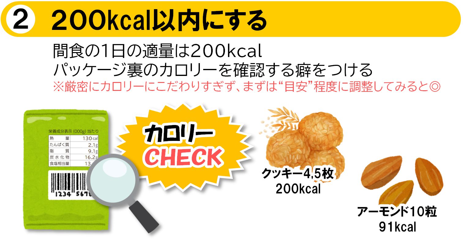 間食(おやつ)をとるときには、「1日あたり200kcal以内にする」など決めておくと、余分な糖分や脂肪分のとりすぎを防げます。