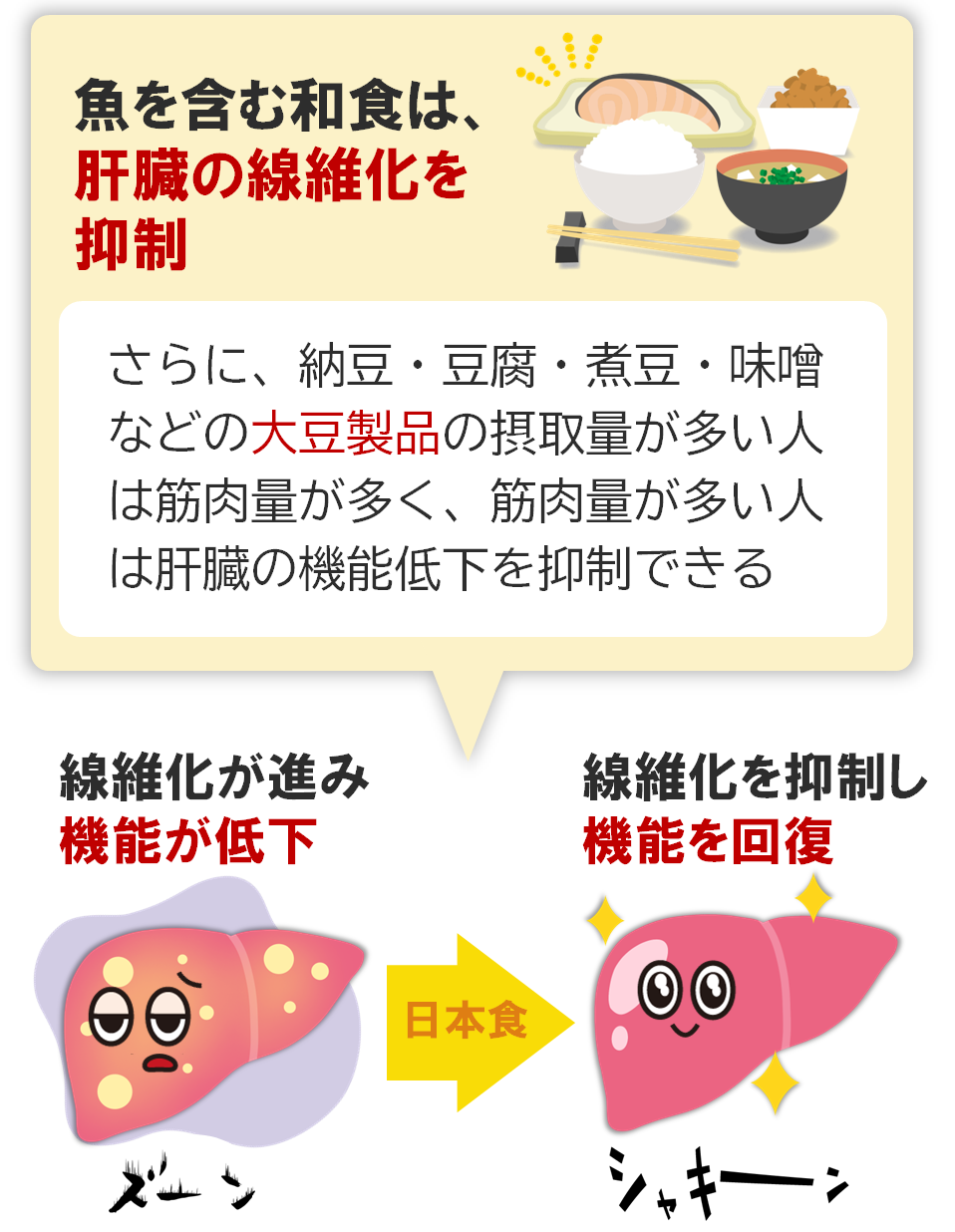 「日本食」特に魚、大豆、海藻の摂取が多いと、肝臓の線維化を抑制できます。