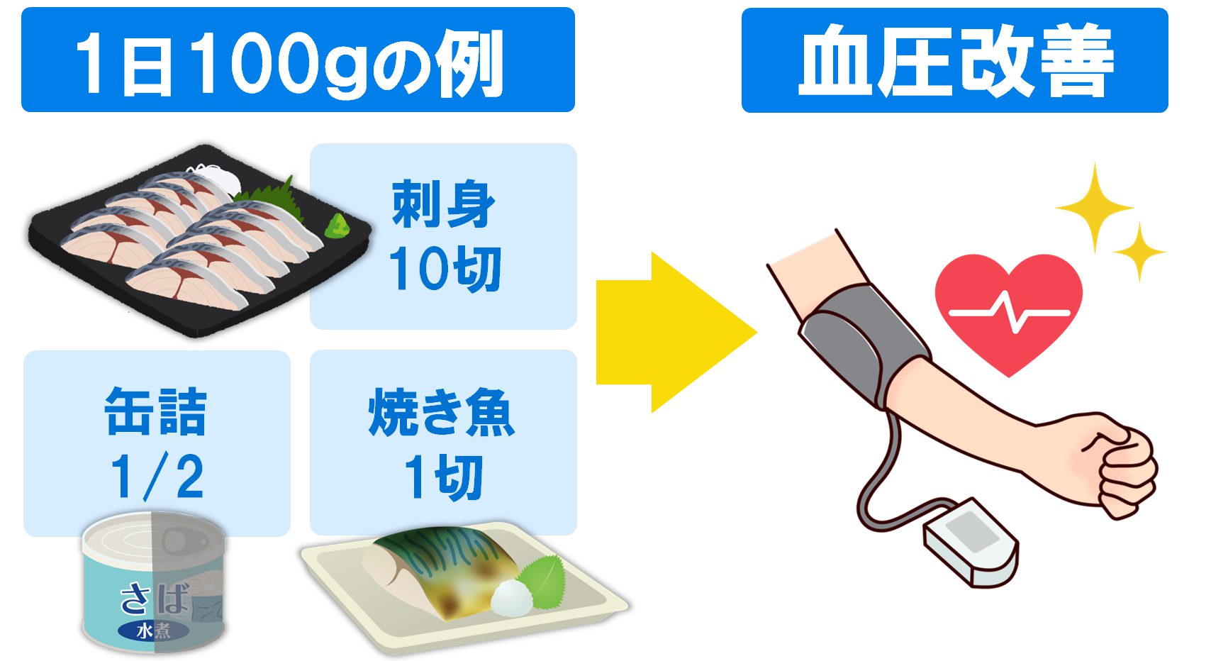 n-3系脂肪酸を1日約3g(青魚100~150g相当)摂取することで、高血圧症の人は最高血圧(収縮期血圧)が平均4.5mmHg低下、高血圧症ではない人でも平均2mmHg低下したという研究結果もあります。
