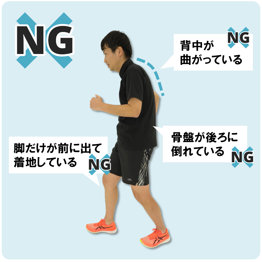 背中が曲がり、骨盤が後ろに倒れてしまうと、脚だけで前方に着地してしまい、ひざや腰への負担が増えます。骨盤を立てて、からだの真下に着地するイメージで行いましょう。