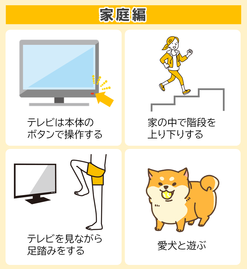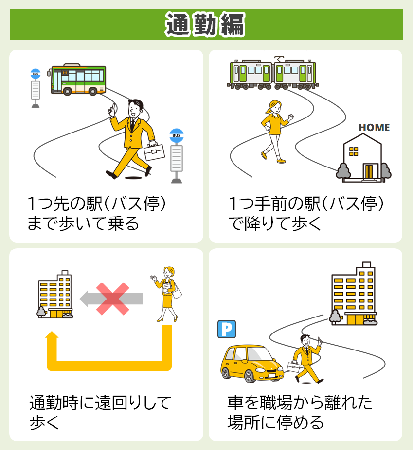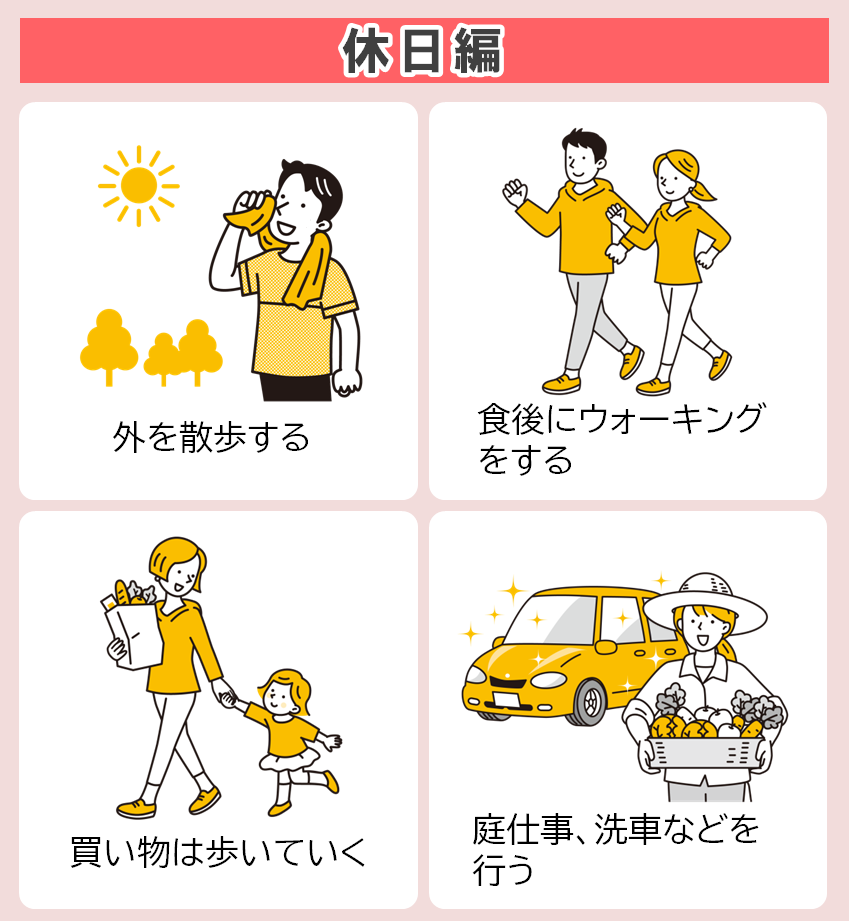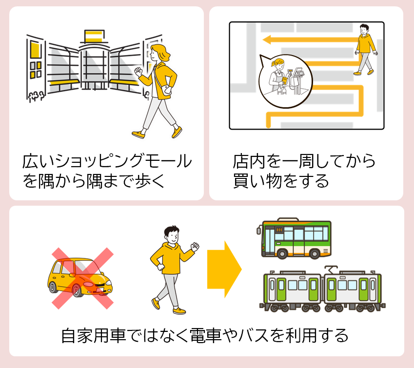 1日の生活の中で、からだを意識的に動かし今よりも+1,000歩(約10分)になるよう心がけることが大切です。