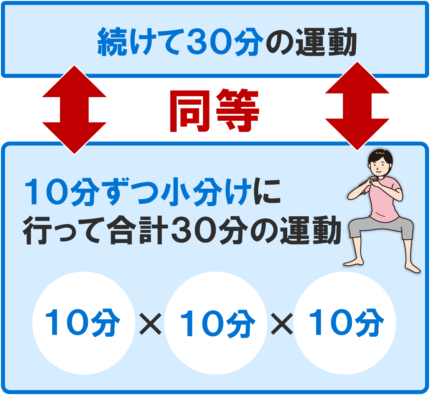 「続けて30分の運動」と「10分ずつ小分けに行って合計30分の運動」の効果はほぼ同等と言われています。できるタイミングで取り組むのが続けやすくおすすめです。