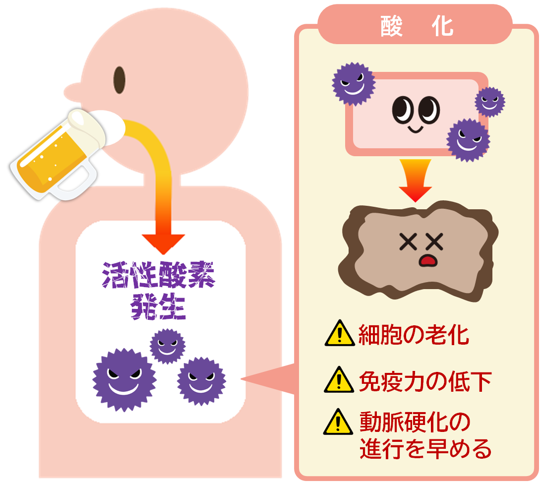 アルコールが体内で分解される過程で「活性酸素」が発生します。この活性酸素には、細胞の老化や免疫力の低下を招いたり、動脈硬化を進みやすくする作用があります。