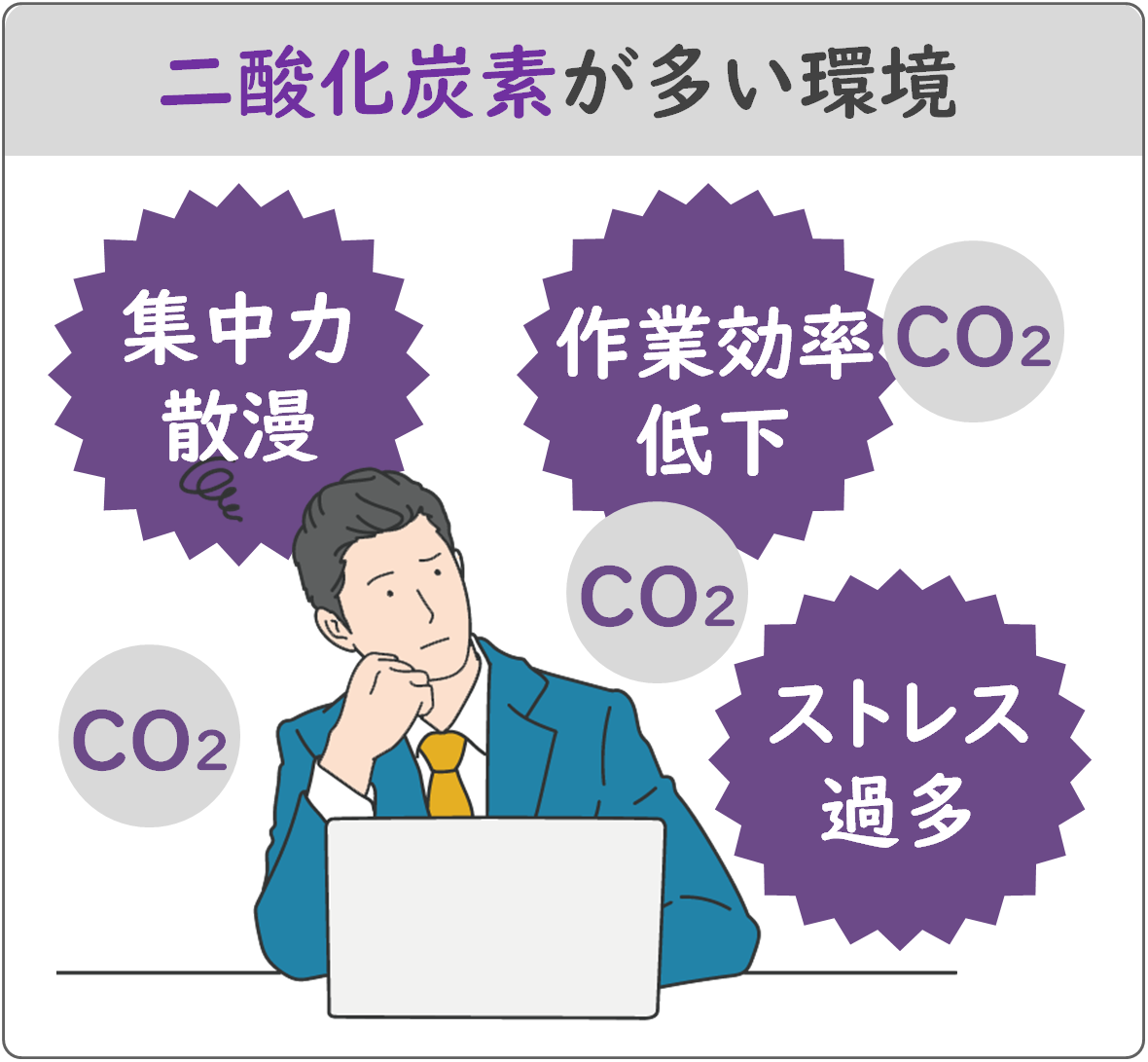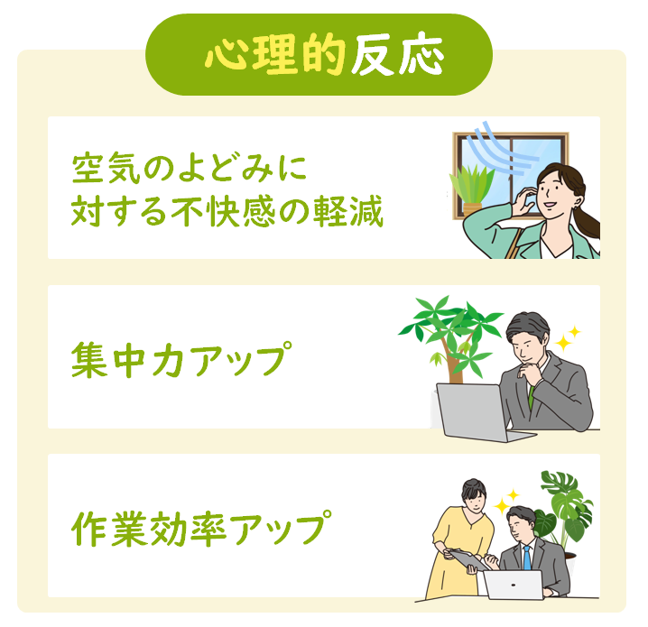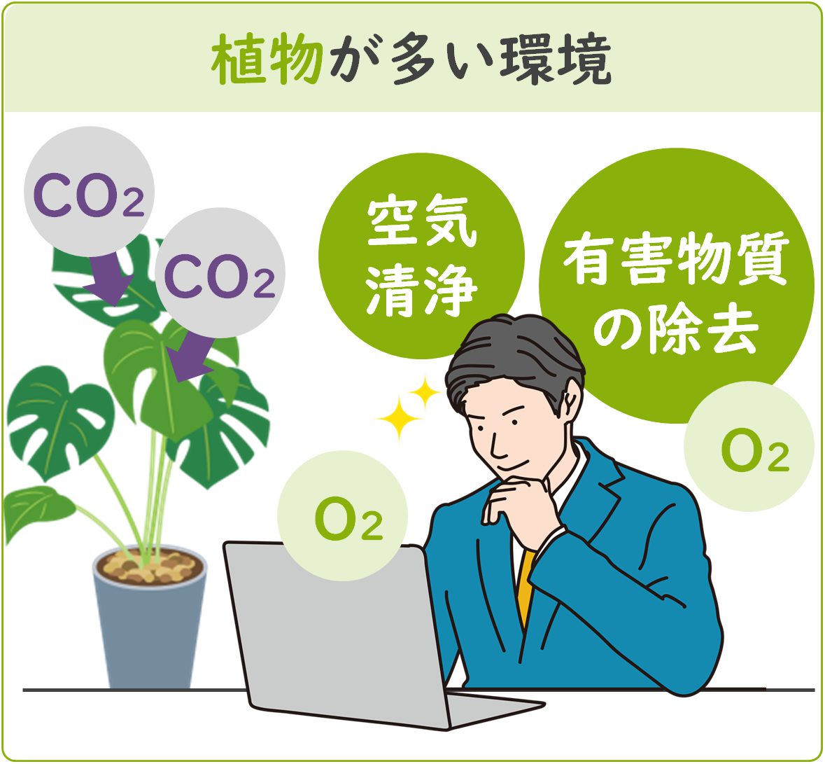 二酸化炭素が多い環境では集中力が散漫になり作業効率が下がる他、ストレス過多になる傾向があるとされています。一方、植物が多い環境は二酸化炭素の濃度を下げ、こうした状況を回避する効果が期待できます。
