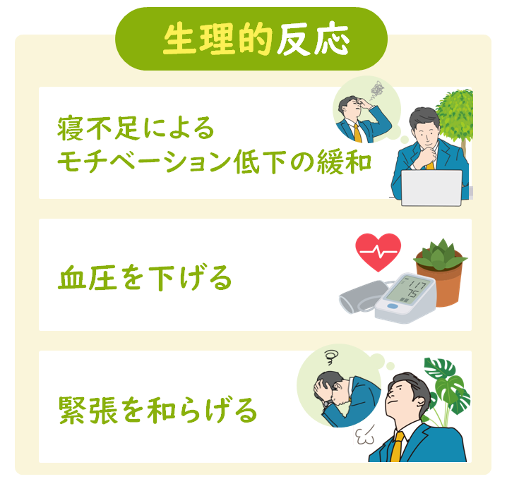 植物は、フィトンチッドと呼ばれる香り成分を放出し、リラックス効果をもたらすと言われています。観葉植物もフィトンチッドを放出しており、視界に占める観葉植物の割合が高いほど、心理的ストレス・生理的ストレスが低くなることが報告されています。