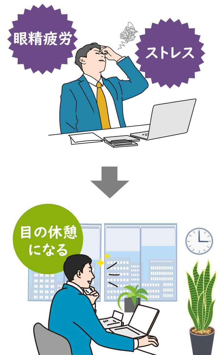室内に観葉植物があると自然と視線が植物に向くため、「目のための休息時間」を設けることができます。