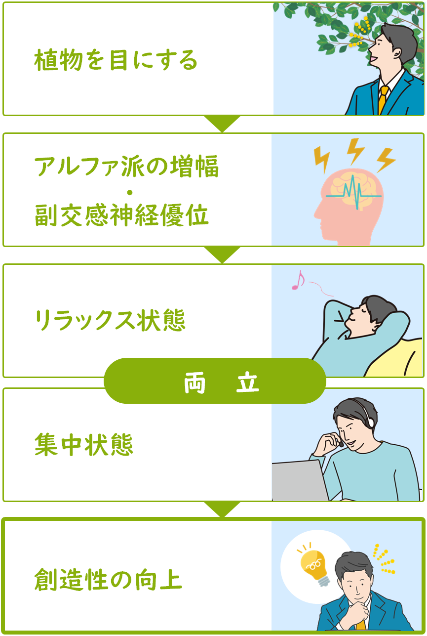 ヒトは森林などの自然の中で、無意識のうちに「ストレスが軽減される」「気分がスッキリする」と感じるものです。しかし、室内で過ごす時間が長い現代人にとっては、植物のこうした効果が、室内環境においてますます重要と言えるでしょう。