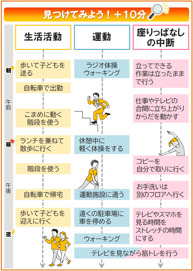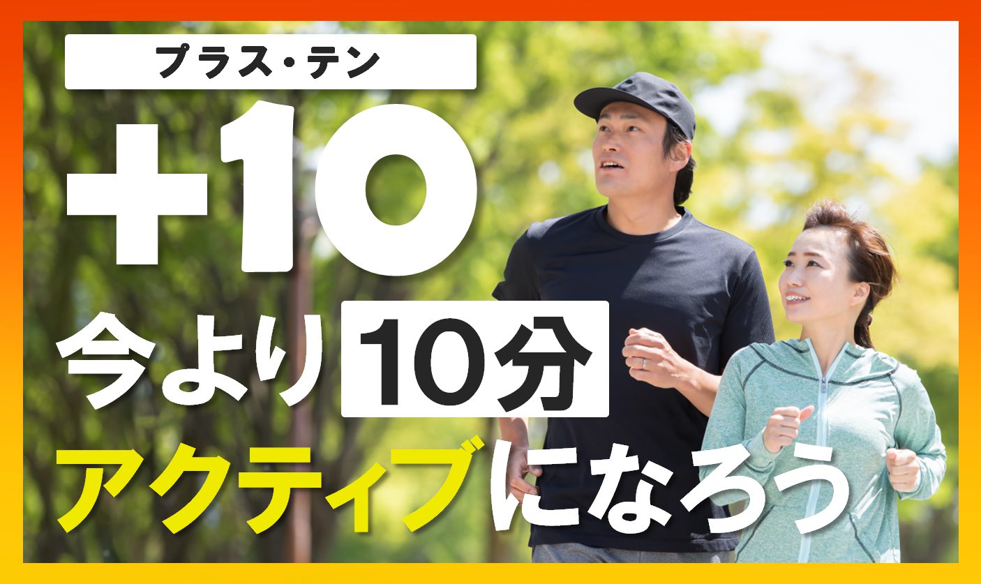 今より少しでも多くからだを動かすことは、健康づくりの第一歩。1日あたり10分身体活動を増やすと、生活習慣病や死亡リスクが低下することがわかっています。