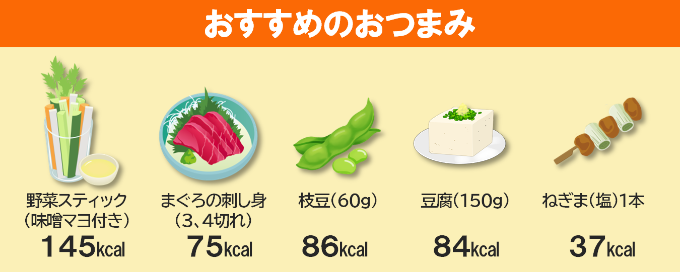 さっぱりとしたおつまみを選ぶことで、余分なカロリーを抑えながら、アルコールの分解に必要なビタミン・ミネラル・たんぱく質も補えます。