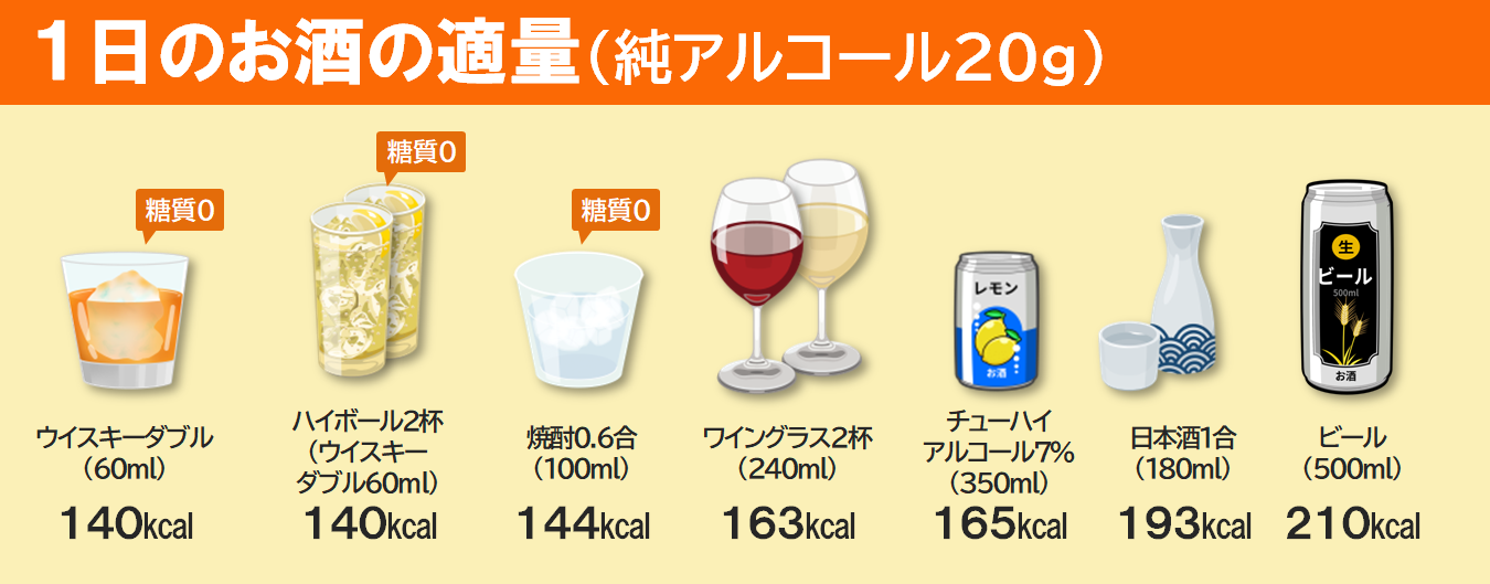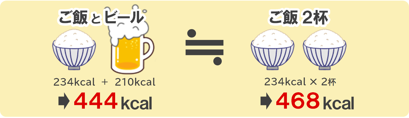 ご飯1杯とビール500mlのカロリーはほぼ同じです。両方とるとご飯をおかわりしているのと同じくらいのエネルギー量になり、知らないうちに脂肪を溜めこむ原因になっているかもしれません。
