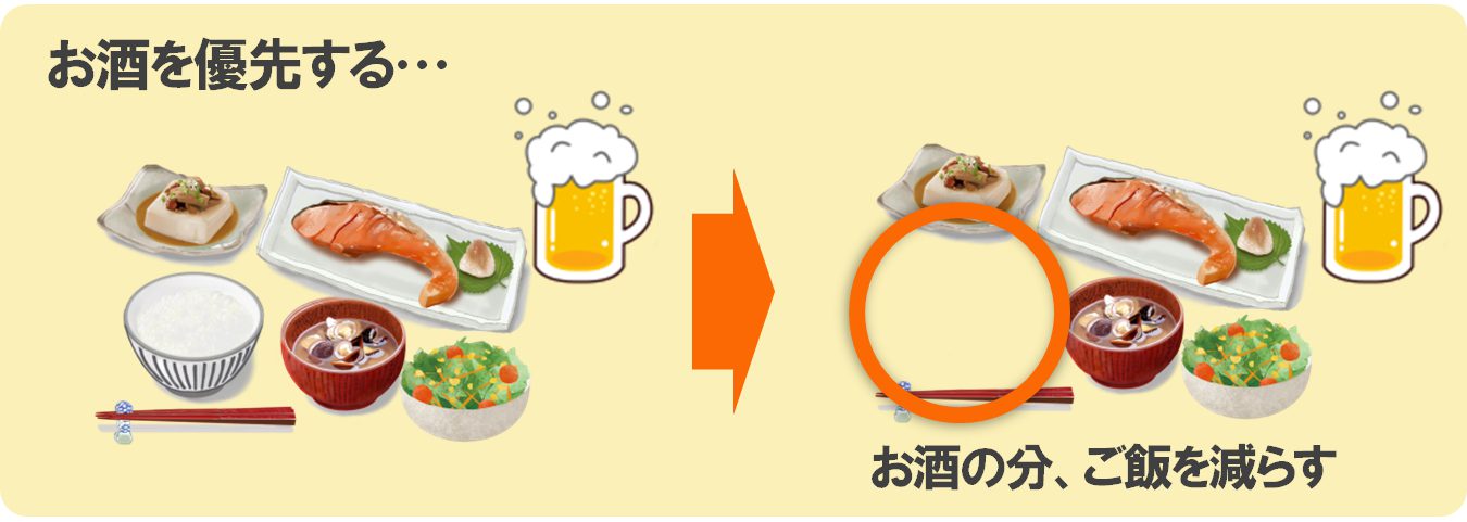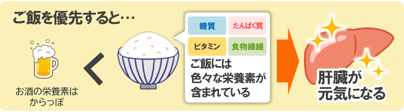 ご飯には色々な栄養素が含まれていますが、お酒にはほとんど栄養がありません。ご飯を優先することで栄養をしっかり補え、肝臓の負担も軽減できます。