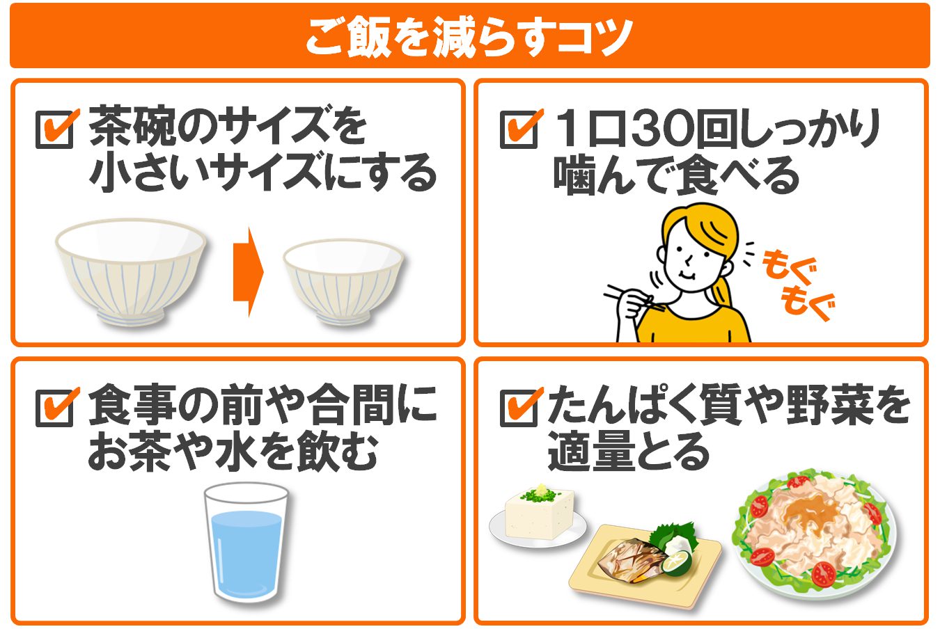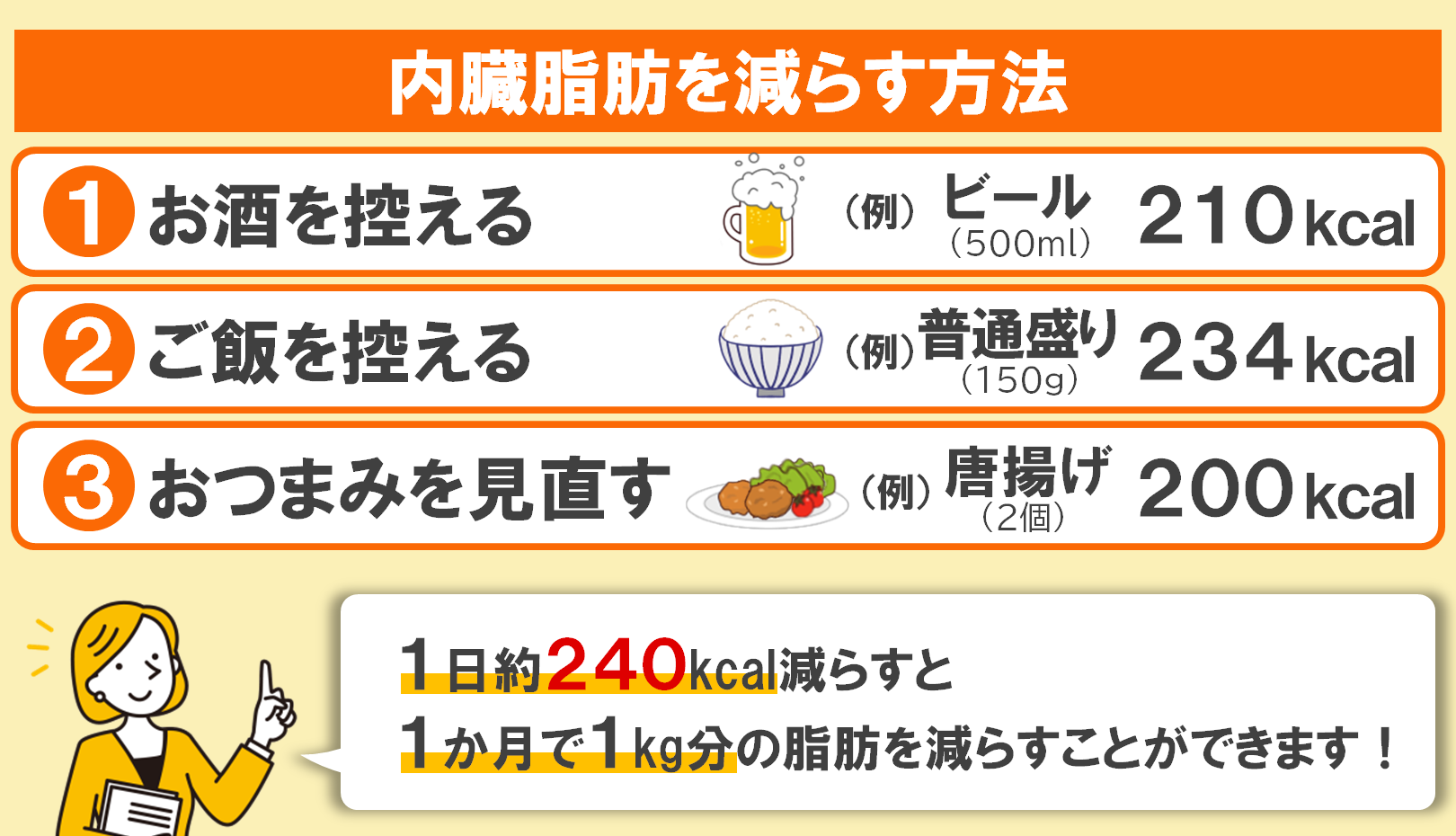 お酒を控えるのが難しい時は、その分ご飯を減らして調整しましょう。