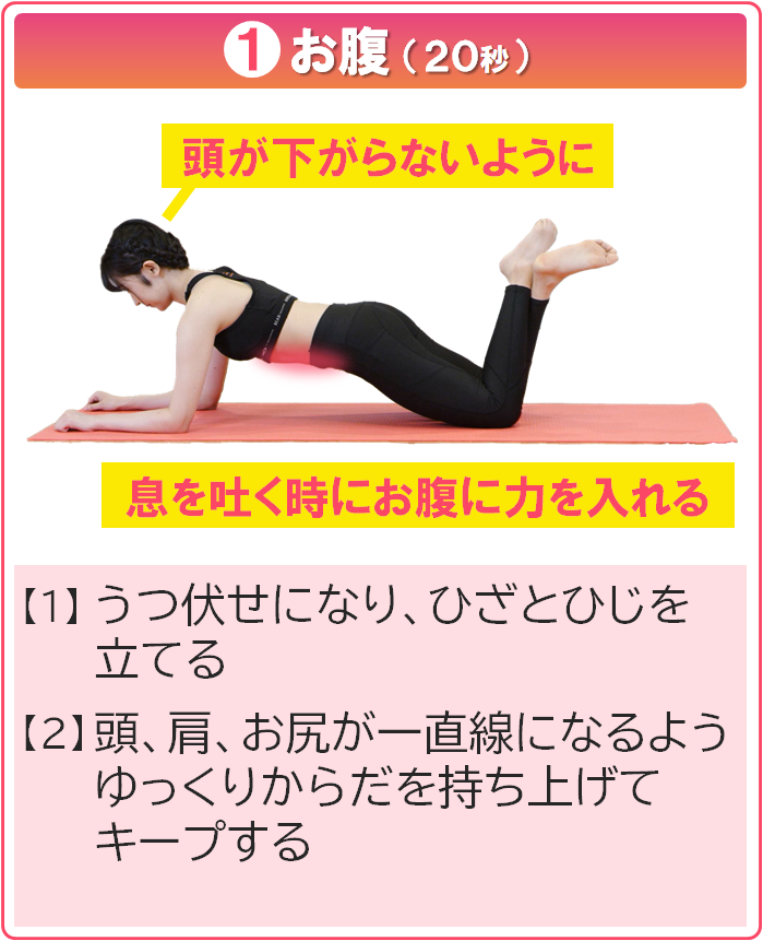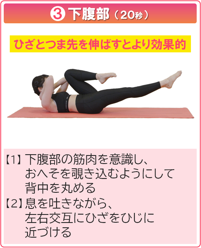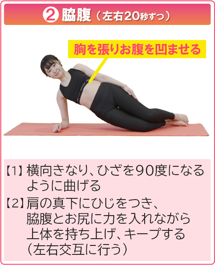 14191 【ピ】お腹まわりスッキリ解消 2分エクササイズ 15 歩数 2025.07.24 脇腹や下腹部の筋肉は、姿勢やボディラインを美しく保つカギ。 テレビを見ながらできる2分間エクササイズで、お腹まわりをスッキリ整えましょう! ※下記に該当する方は、必要に応じて医療機関を受診するなど、運動前に健康チェックを行い、安心・安全に運動を進めてください。 【血圧】診察時180/110mmHg以上、家庭測定時160/100mmHg以上 【血糖】空腹時血糖250㎎/dl以上 【その他】運動の影響で作用が強まる薬を服用中、運動で悪化する可能性がある整形外科的な不調がある このエクササイズで得られる効果 エクササイズの方法 1日2~3セット行うのがおすすめです。 動画でチェックしたい方はコチラ↓